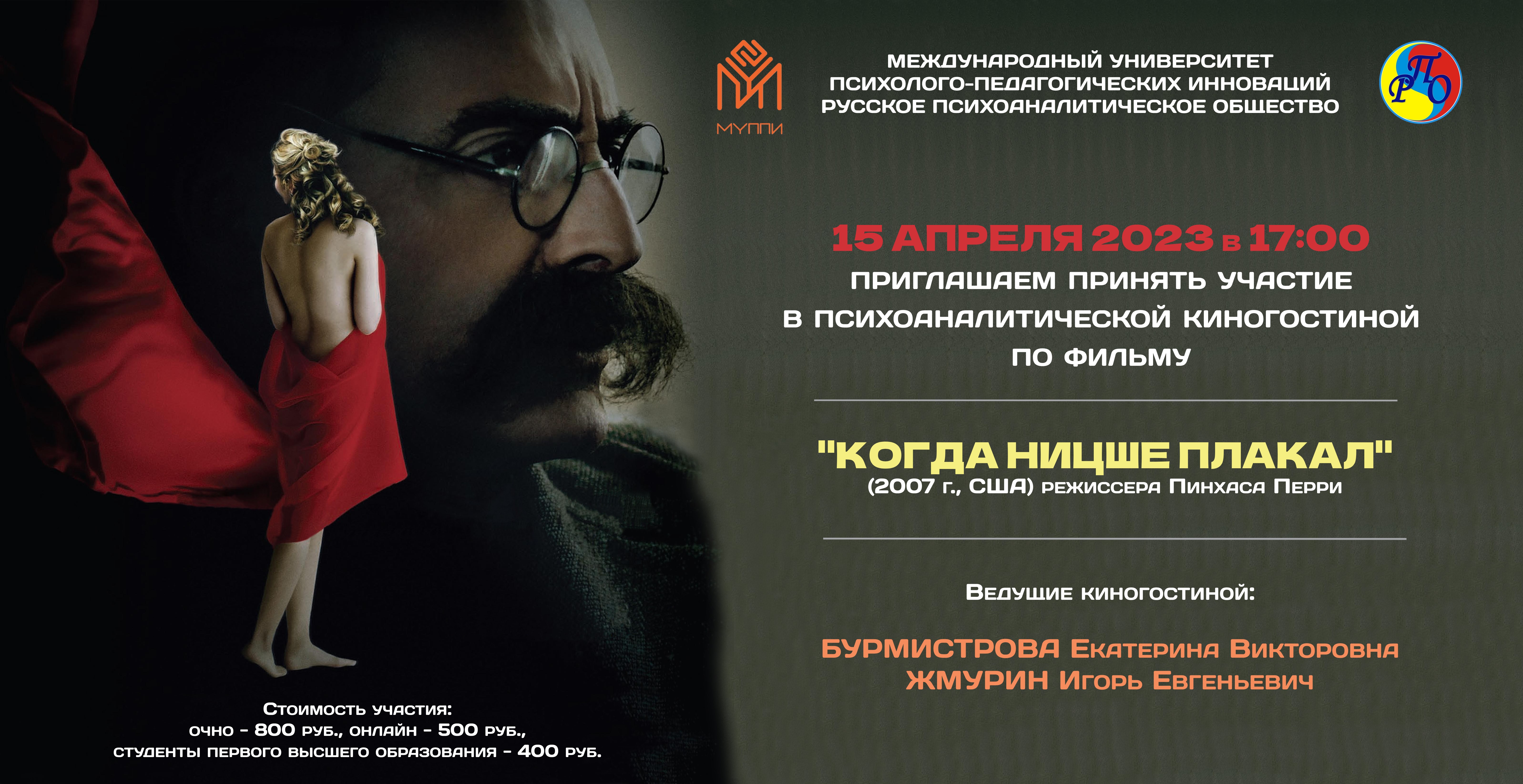 Приглашаем всех, кто интересуется творчеством И. Ялома, Ф. Ницше и З. Фрейда, кого трогает тема душевных терзаний, любви и одиночества, сострадания и дружбы. Тем, кто ценит интеллектуальное кино, оставляющее после просмотра послевкусие и вопросы, на которые каждый ответит по-своему.